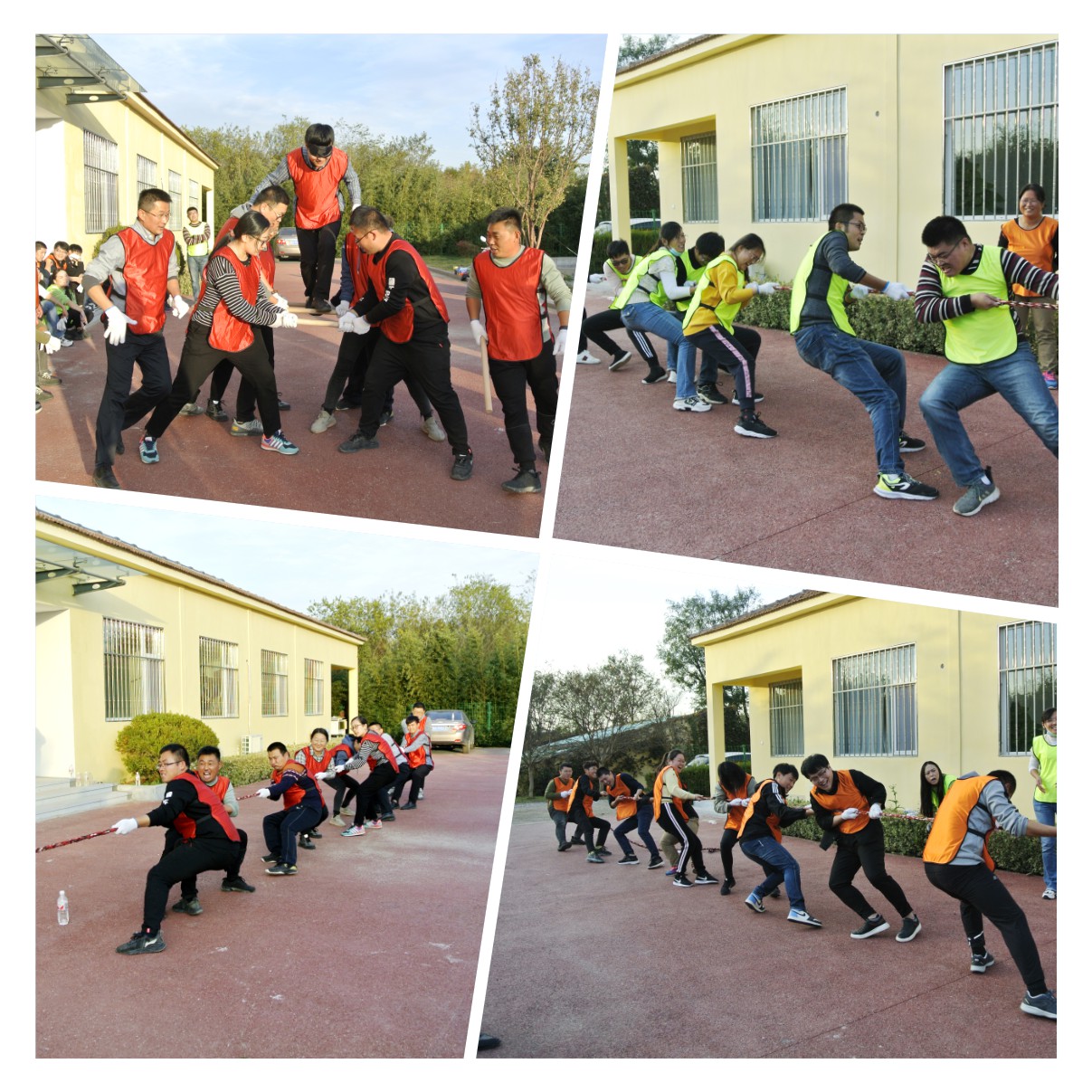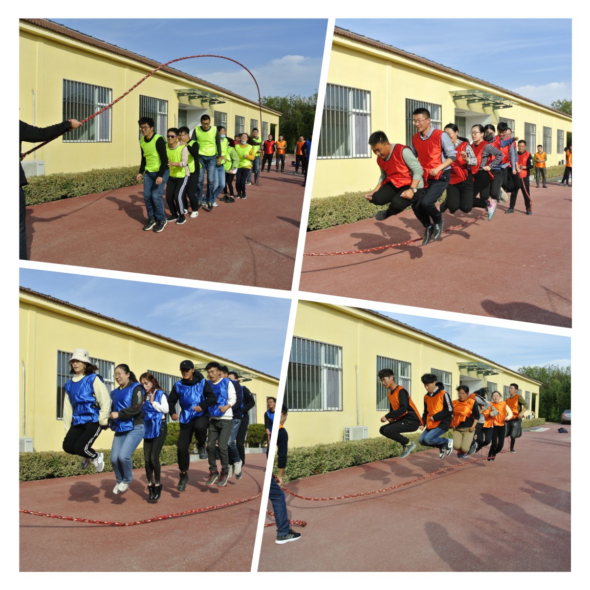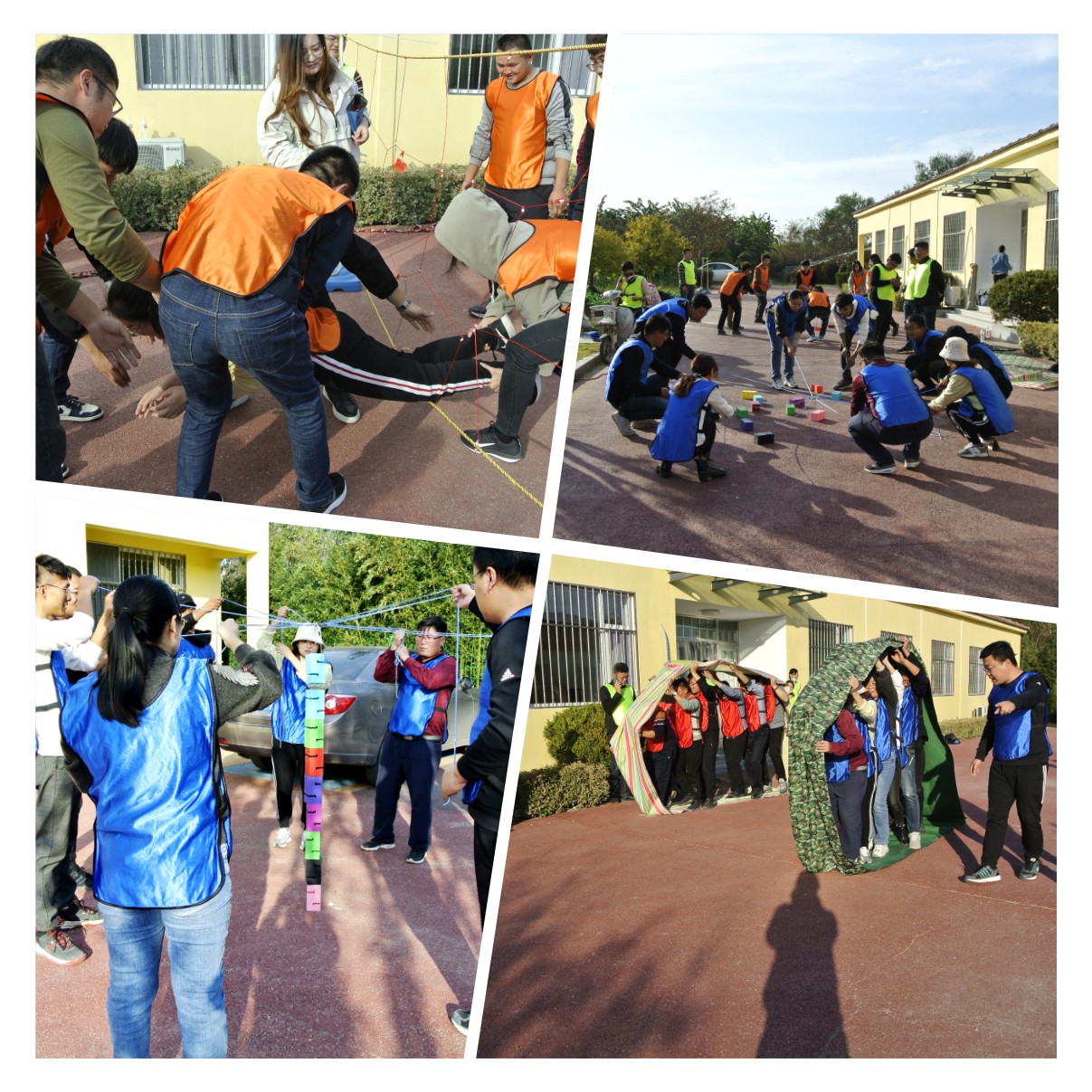 本次趣味運動會設有跳大繩、穿越電網、車輪滾滾、合力建塔、袋鼠跳跳、信任天梯、拔河七個比賽項目。參賽隊員全部打亂順序混編成四組,并推選出一名隊長。“跳大繩”作為傳統比賽項目優先登場,由兩名隊員搖繩把握節奏,跳繩隊員快慢有序穿梭于繩索之間,隊長統一指揮、技術協作奠定了取勝的關鍵。“穿越電網”項目發揮的是隊員們群策全力和智慧力量的融合,比賽異常激烈。在“車輪滾滾”項目環節中,各隊隊員們齊心協力,保持口令一致、步調一致、節奏一致,穩步前行地沖向終點。合力建塔、袋鼠跳跳、信任天梯、拔河等項目也在各隊的拼搏和歡快中逐一完賽。