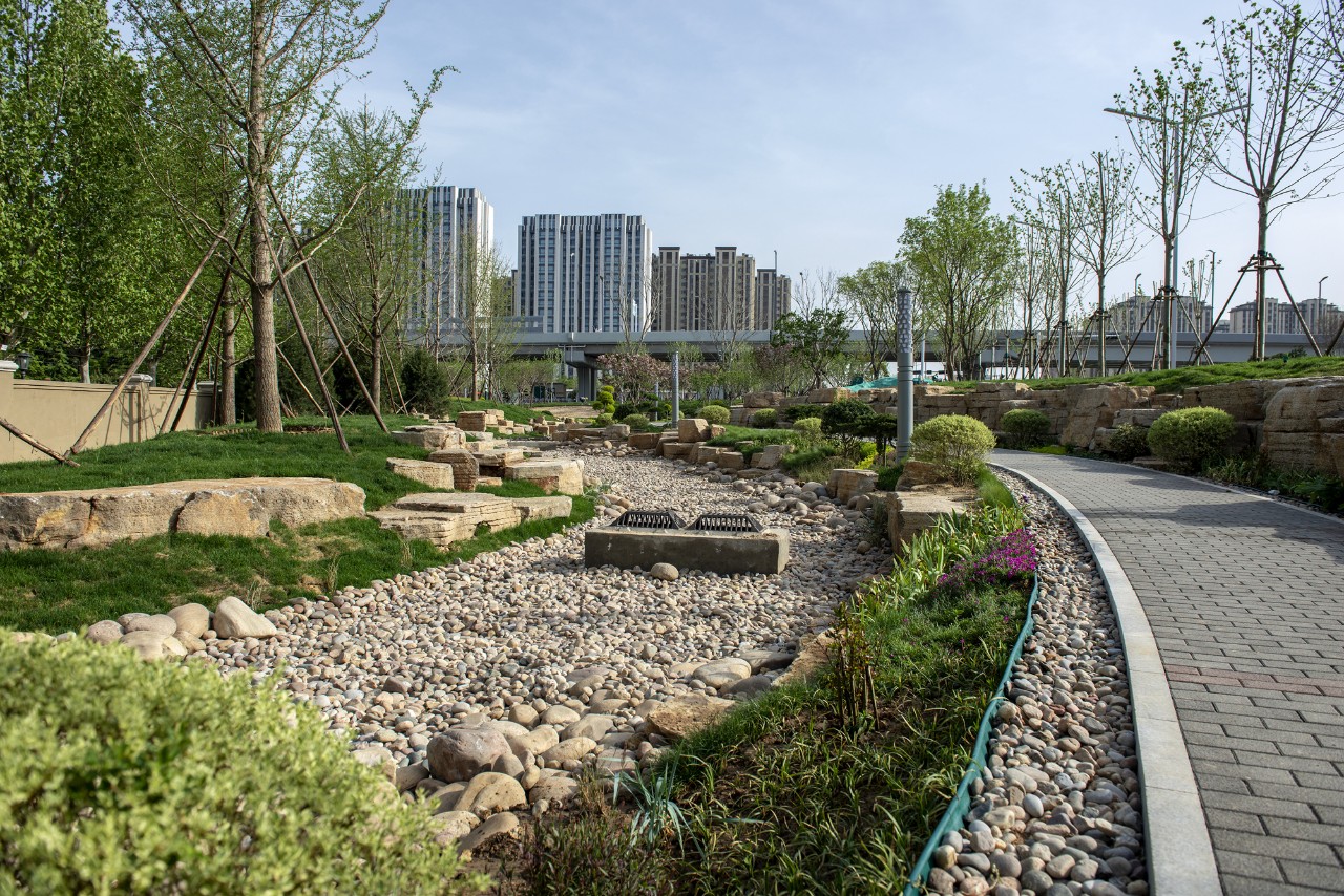 寶通街快速路景觀綠化作為濰坊市海綿城市示范建設(shè)重點項目,引領(lǐng)各方關(guān)注,對全市海綿城市系統(tǒng)化建設(shè)具有引領(lǐng)示范帶頭作用。昌大園林公司和項目部充分貫徹設(shè)計理念,精細化施工,把海綿城市的理念貫徹到每一個施工細節(jié),打造出采用陶瓷透水磚園路鋪裝、下沉式綠地、雨水花園、渤海路節(jié)點旱溪等豐富的生態(tài)環(huán)境,再精心配置不同種類、色彩、造型的景觀小品及苗木,讓道路沿線綠化景觀形成豐富的節(jié)奏和層次變化,使寶通街快速路綠化成為既是海綿又是風(fēng)景的特色景觀。